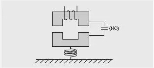 電磁開(kāi)關(guān)主要有交流接觸器及繼電器兩種類(lèi)型,一般常用于低壓工業(yè)配線及控制馬達(dá)起動(dòng)。主要電路結(jié)構(gòu)見(jiàn)圖5,有一個(gè)電磁線圈、一個(gè)可動(dòng)鐵心及彈簧。其原理為當(dāng)電流流過(guò)上方的電磁線圈時(shí),上方的鐵心產(chǎn)生的電磁力將吸引下方可動(dòng)鐵心,導(dǎo)致常開(kāi)點(diǎn)(NO)鐵心閉合,常閉點(diǎn)(NC)則因?yàn)榭蓜?dòng)鐵片離開(kāi)接點(diǎn)而開(kāi)啟。
