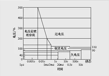 ITIC曲線橫軸為電壓干擾(電壓降或電壓升)的持續(xù)時(shí)間,縱軸為電壓干擾時(shí)的電壓大小(以百分比表示),上方曲線代表設(shè)備對(duì)電壓升的忍受能力,下方曲線則表示設(shè)備對(duì)電壓降的忍受能力,二曲線的中間表示設(shè)備能夠正常運(yùn)行不受電壓變動(dòng)所影響的范圍。SEMI代表半導(dǎo)體機(jī)臺(tái)制造業(yè),SEMI F47曲線標(biāo)準(zhǔn)是提供半導(dǎo)體產(chǎn)業(yè)設(shè)備的規(guī)范,引導(dǎo)半導(dǎo)體設(shè)備制造商在設(shè)備系統(tǒng)設(shè)計(jì)制造上符合此標(biāo)準(zhǔn)。