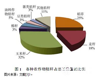 農(nóng)作物秸稈是地球上第一大可再生資源。國家農(nóng)業(yè)部完成了首次全國農(nóng)作物秸稈資源專項(xiàng)調(diào)查,并發(fā)布了《全國農(nóng)作物秸稈資源與評(píng)價(jià)報(bào)告》。據(jù)調(diào)查統(tǒng)計(jì)顯示(圖1),2009年,全國農(nóng)作物秸稈理論資源量為8.20億t(風(fēng)干,含水量為15%);從品種上看,稻草約為2.05億t,占理論資源量的25%;麥秸為1.50億t,占18.3%;玉米秸為2.65億t,占32.3%;棉稈為2584萬t,占3.2%;油料作物秸稈(主要為油菜和花生)為3737萬t,占4.6%;豆類秸稈為2726萬t,占3.3%;薯類秸稈為2243萬t,占2.7%[3]。