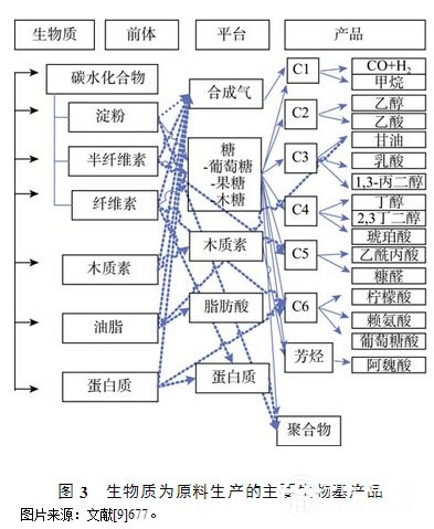 生物質(zhì)可以與化石資源一樣被用來生產(chǎn)化工原料等物質(zhì)性產(chǎn)品(圖3)。生物質(zhì)原料組成豐富,不同原料組分差別很大,如農(nóng)作物秸稈的主要組分為纖維素、半纖維素和木質(zhì)素,薯類的主要組分為淀粉,而油料作物種子則以油脂為主要組分。但歸納起來植物原料主要有4種基本化學(xué)物質(zhì):碳水化合物(糖、淀粉、纖維素和半纖維素)、木質(zhì)素、脂類和蛋白質(zhì),包括多種物質(zhì),并含有羥基、羰基、苯環(huán)等含氧基團(tuán),與石油原料只含—(CH2)n—線性聚合結(jié)構(gòu)相比較,能提供生物燃料等生物質(zhì)能源以外更多的開發(fā)新產(chǎn)品的機(jī)會(huì),更有利于進(jìn)行化學(xué)改造、生產(chǎn)各類化工產(chǎn)品。
