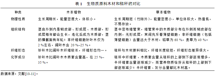 生物質(zhì)原料是生物質(zhì)產(chǎn)業(yè)之本,包括廢棄生物資源(農(nóng)林廢棄物、禽畜糞便、有機(jī)垃圾、有機(jī)廢水等)、專用能源作物(木薯、甘薯、甜高粱、菊芋等)、專用能源植物(黃連木、麻風(fēng)樹、油桐、文冠果、光皮樹、烏桕等)。農(nóng)作物秸稈是最具有代表性的木質(zhì)纖維素資源。秸稈和木材同屬于木質(zhì)纖維素,都由纖維素、半纖維素和木質(zhì)素組成,然而兩者在結(jié)構(gòu)和化學(xué)組成上卻有較大的差異,其轉(zhuǎn)化特性也不同(表1)。