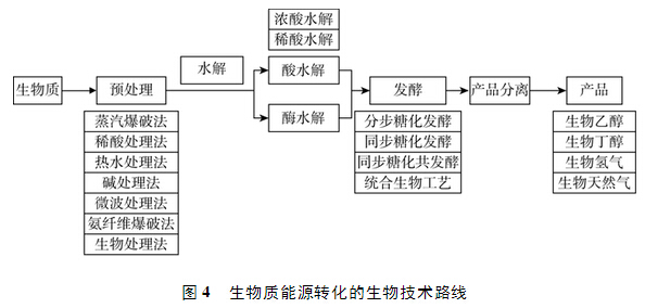 生物質(zhì)轉(zhuǎn)化的途徑中,生物技術(shù)路線轉(zhuǎn)化法因性質(zhì)溫和、對(duì)環(huán)境后續(xù)影響低、溫室氣體排放少,成為生物質(zhì)產(chǎn)業(yè)研究開發(fā)的重點(diǎn)之一(圖4)。以生物質(zhì)能源的生產(chǎn)為例,生物質(zhì)資源預(yù)處理后水解為單糖,利用微生物復(fù)雜的酶系和一系列的生物化學(xué)代謝途徑,將單糖轉(zhuǎn)化為生物能源,如生物乙醇、生物丁醇、生物氫氣、生物天然氣等,以及生物基化學(xué)品如乳酸、檸檬酸[13]。