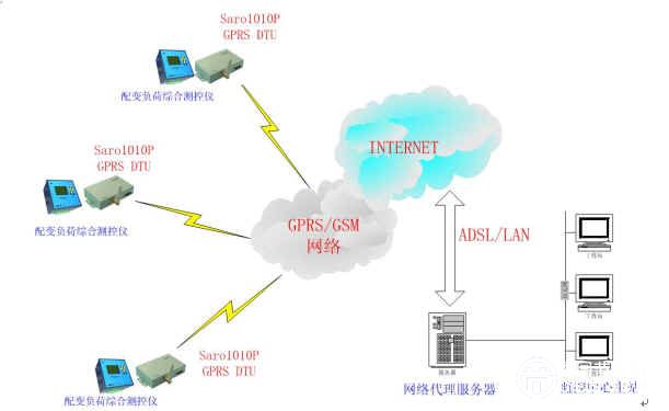 GPRS配電變壓器監(jiān)控系統(tǒng)的網(wǎng)絡(luò)架構(gòu)如下圖所示,系統(tǒng)分為四個部分,分別是監(jiān)控中心主站、網(wǎng)絡(luò)代理服務(wù)器、GPRS數(shù)據(jù)傳輸終端、監(jiān)控終端設(shè)備。主站主要完??機(jī)交互工作;網(wǎng)絡(luò)代理服務(wù)器主要負(fù)責(zé)網(wǎng)絡(luò)數(shù)據(jù)鏈路建立和數(shù)據(jù)收發(fā)的透明中轉(zhuǎn);GPRS數(shù)據(jù)傳輸終端完成信息的上送與下發(fā);監(jiān)控終端設(shè)備主要完成數(shù)字量與模擬量的采集。