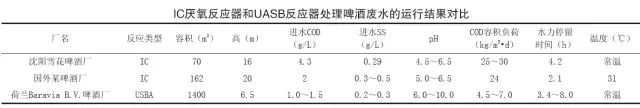 全球已建成的IC厭氧反應(yīng)器大部分用于處理啤酒廢水。目前我國已有多家啤酒廠應(yīng)用了此工藝。IC厭氧反應(yīng)器和UASB反應(yīng)器處理啤酒廢水的對比情況見下表所示。由表可見,IC厭氧反應(yīng)器處理啤酒廢水的COD容積負(fù)荷可達(dá)15~30kg/m3˙d,水力停留時間為2~4.2h,去除率在75%以上,而處理啤酒廢水的UASB反應(yīng)器的COD容積負(fù)荷一般僅為4~7kg/(m3˙d)。