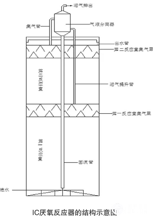 內(nèi)循環(huán)(IC)厭氧反應(yīng)器是在上流式厭氧污泥床(UASB)反應(yīng)器基礎(chǔ)上發(fā)展起來的高效反應(yīng)器。其依靠沼氣在升流管和回流管間產(chǎn)生的密度差在反應(yīng)器內(nèi)部形成流體循環(huán)。