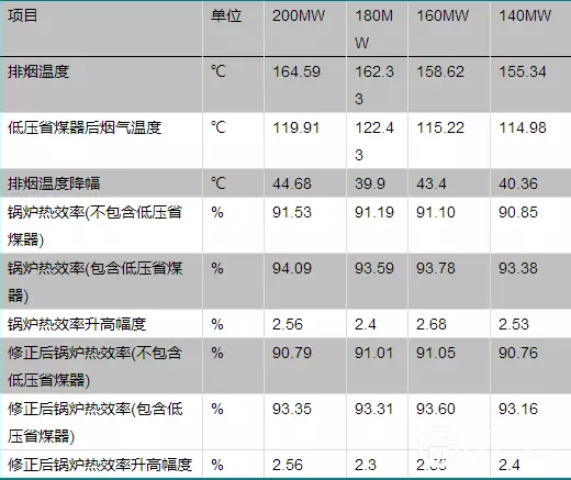 2.投入低壓省煤器后鍋爐最終排煙溫度明顯降低,不同負荷下平均降低幅度約為42℃,包括低壓省煤器在內的鍋爐整體熱效率得到大幅度的提升,平均提升幅度約為2.54個百分點,修正到鍋爐設計工況下鍋爐熱效率提高幅度約為2.45個百分點。
