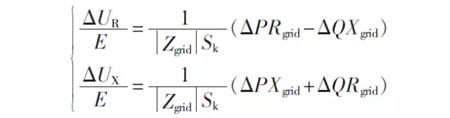 在風(fēng)速擾動下,DFIG 注入微電網(wǎng)系統(tǒng)功率變化時,會使線路上的電流產(chǎn)生 ΔI 的變化,在風(fēng)機并網(wǎng)點的電壓變化值為: