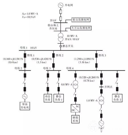 研究系統(tǒng)為珠海萬山海島新能源微電網(wǎng)示范項目東澳島智能微電網(wǎng),系統(tǒng)規(guī)劃單線圖如下圖所示。
