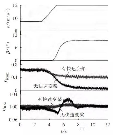 在風(fēng)速擾動過程中,小方式二下DFIG快速變槳控制可有效提高微電網(wǎng)靜態(tài)電壓穩(wěn)定性,其控制策略如下圖所示。