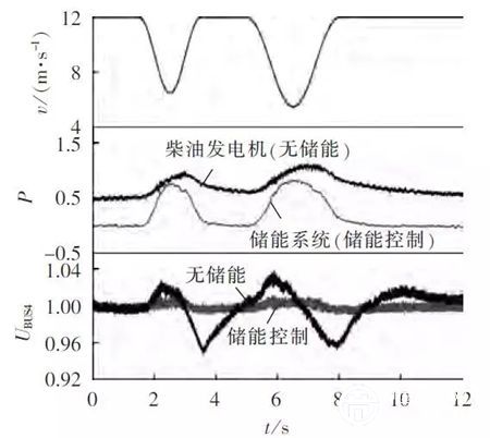 算例1大方式一下儲能系統(tǒng)平滑風(fēng)電功率波動改善小擾動電壓穩(wěn)定性。下圖描述了連續(xù)陣風(fēng)擾動下儲能系統(tǒng)參與控制/無儲能 2 種情況下微電源有功響應(yīng)與母線4電壓特性(均為標(biāo)幺值)??梢姡诖蠓绞揭幌聝δ芟到y(tǒng)有效地改善了微電網(wǎng)小擾動電壓穩(wěn)定性。