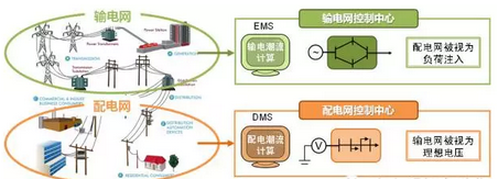 眾所周知, 一個實際電力系統(tǒng)的輸、配電部分在物理上是通過變壓器而緊密耦合的, 但為了方便管理, 目前的輸、配電網(wǎng)幾乎都是由不同的控制中心來進行調(diào)控。對于輸電網(wǎng), 通常由EMS軟件進行管理, 而對于配電網(wǎng), 通常由DMS軟件進行管理。