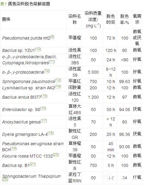 多數(shù)具有偶氮染料脫色能力的細(xì)菌為好氧生長,但對(duì)偶氮染料的脫色降解多發(fā)生在厭氧或微氧條件下。同時(shí),由于研究所用的培養(yǎng)基、染料結(jié)構(gòu)和濃度以及其他培養(yǎng)條件存在差異,導(dǎo)致無法比較脫色效率。