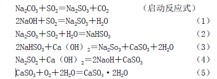 在上述化學(xué)反應(yīng)式可以分為3個(gè)階段:前兩個(gè)反應(yīng)式表示脫硫階段;中間兩個(gè)反應(yīng)式表示鈣鈉再生階段;最后一個(gè)反應(yīng)式則表示強(qiáng)制氧化,生成石膏階段。