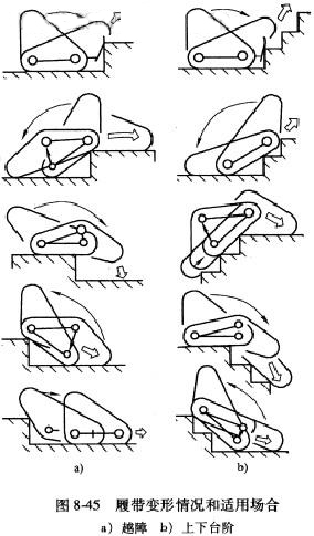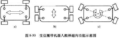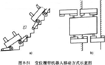 變位履帶機(jī)器人集履帶式機(jī)器人和全方位輪式機(jī)器人的優(yōu)點(diǎn)于一身。當(dāng)其履帶沿一個(gè)自由度方向變位時(shí),可用于攀爬階梯和跨越溝渠(見(jiàn)圖8-50);當(dāng)其履帶沿另一個(gè)自由度方向變位時(shí),可實(shí)現(xiàn)車(chē)體的全方位行走方式(見(jiàn)圖8-51)。