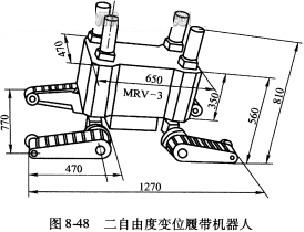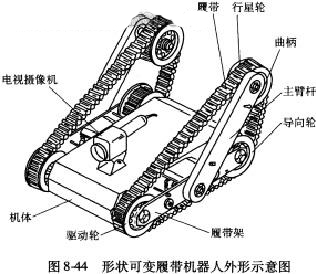 所謂位置可變履帶機(jī)器人,是指履帶相對(duì)于車(chē)體的位置可以發(fā)生變化的履帶式機(jī)器人。這種位置的改變既可以是一個(gè)自由度的,也可以是兩個(gè)自由度的。圖8-48所示為一種二自由度變位履帶機(jī)器人,各履帶能夠繞車(chē)體的水平軸線(xiàn)和垂直軸線(xiàn)偏轉(zhuǎn),從而改變機(jī)器人的整體構(gòu)形。