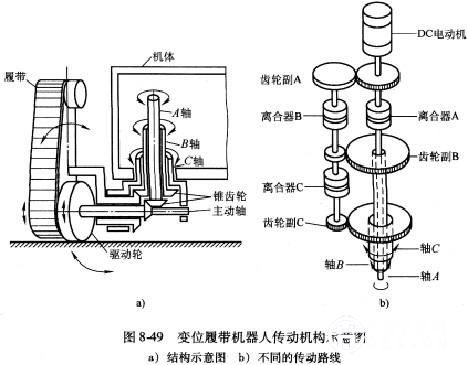 圖8-49為上述變位履帶機(jī)器人傳動(dòng)機(jī)構(gòu)示意圖。由圖8-49a可知,當(dāng)A軸轉(zhuǎn)動(dòng)時(shí),通過(guò)一對(duì)錐齒輪的嚙合,將運(yùn)動(dòng)傳遞給驅(qū)動(dòng)輪,從而帶動(dòng)履帶運(yùn)動(dòng);當(dāng)B軸轉(zhuǎn)動(dòng)時(shí),通過(guò)另一對(duì)錐齒輪的嚙合,帶動(dòng)與履帶架相連的曲柄,使履帶繞主動(dòng)軸軸線(xiàn)回轉(zhuǎn)變位;當(dāng)C軸傳動(dòng)時(shí),履帶連同其安裝架一起繞C軸線(xiàn)相對(duì)于車(chē)體轉(zhuǎn)動(dòng),改變其位置。A、B、C三軸由一臺(tái)電動(dòng)機(jī)帶動(dòng),通過(guò)切換A、B、C三個(gè)離合器,使之實(shí)現(xiàn)不同的傳動(dòng)路線(xiàn),具體情況參見(jiàn)圖8-49b。