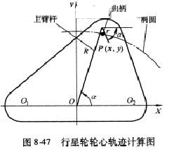 圖8-47為行星輪輪心軌跡計(jì)算圖,由圖可以導(dǎo)出該行星輪輪心P點(diǎn)的運(yùn)動(dòng)軌跡滿(mǎn)足下式: