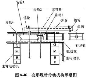 圖8-46所示為變形履帶傳動(dòng)機(jī)構(gòu)示意圖。主電動(dòng)機(jī)帶動(dòng)驅(qū)動(dòng)輪運(yùn)動(dòng),使履帶轉(zhuǎn)動(dòng)。主臂電動(dòng)機(jī)通過(guò)與電動(dòng)機(jī)同軸的小齒輪與齒輪1嚙合,一方面帶動(dòng)主臂桿轉(zhuǎn)動(dòng);另一方面通過(guò)齒輪2、齒輪3和齒輪4的嚙合,帶動(dòng)鏈輪旋轉(zhuǎn);鏈輪通過(guò)鏈條進(jìn)一步使安裝行星輪的曲柄回轉(zhuǎn)。因?yàn)辇X輪1和4,齒輪2和3的齒數(shù)分別相同,因此齒輪1和齒輪4的轉(zhuǎn)速一致,而方向相反。加上鏈條兩端的鏈輪齒數(shù)相等,使得主臂電動(dòng)機(jī)工作時(shí),主臂桿轉(zhuǎn)過(guò)的角度與曲柄的絕對(duì)轉(zhuǎn)角大小相等、方向相反。