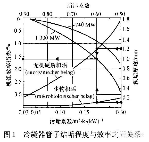 圖l中上部?jī)蓷l斜向右下方的曲線分別代表740Mw和1300Mw透平機(jī)組的污垢系數(shù)或清潔系數(shù)與機(jī)組效率損失的關(guān)系。當(dāng)清潔系數(shù)為0.60(即當(dāng)生物積垢達(dá)0.1mm,或無(wú)機(jī)硬質(zhì)垢達(dá)1.2mm時(shí)),300MW機(jī)組效率下降達(dá)1.6%。