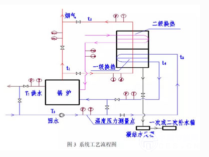 該技術(shù)通過(guò)2段換熱和煙氣冷凝水回收技術(shù),極大降低燃?xì)忮仩t排煙溫度,實(shí)現(xiàn)煙氣余熱的回收利用。首先,通過(guò)一級(jí)換熱裝置,將煙氣溫度降低至60℃以下,回收煙氣中的顯熱;其次,利用常溫空氣預(yù)熱器進(jìn)行冷卻,將煙氣降低至40℃以下,回收煙氣中顯熱及潛熱;最后,將微酸性冷凝純水進(jìn)行處理作為供暖系統(tǒng)的補(bǔ)充水,實(shí)現(xiàn)第三級(jí)余熱回收。同時(shí),該技術(shù)還配有廢氣再循環(huán)系統(tǒng),通過(guò)改變鍋爐燃燒方式,抑制氮氧化物的生成。