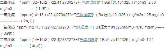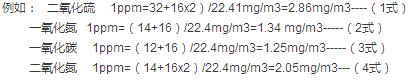 質(zhì)量濃度mg/m3=M氣體分子量/22.4*ppm數(shù)值*[273/(273+T氣體溫度)]*(Ba壓力/101325)M為氣體分子量,ppm為測定的體積濃度值,T為溫度、Ba為壓力。