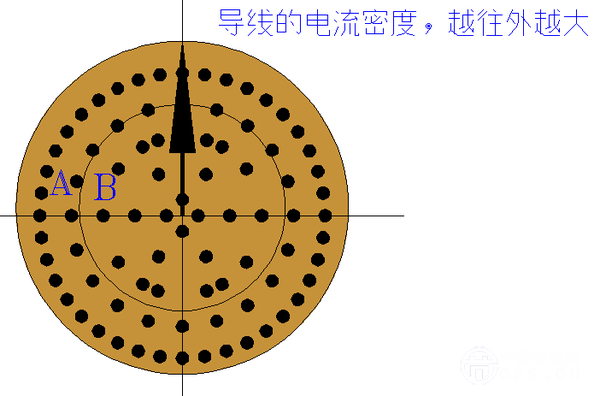 交變磁場在導體中產(chǎn)生反向感應電動勢,其作用將阻礙原電流的變化,使得通過導體截面的電流減少。因此離導體中心越近,感生電動勢越高,阻礙原電流變化的作用越強,導致導體中心部分的電流密度比導體外表部分要小。