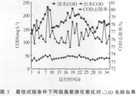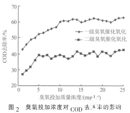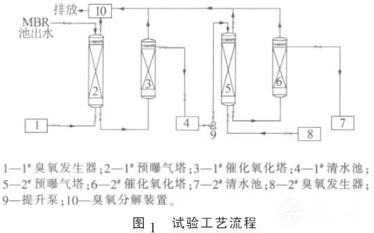 根據(jù)試驗用水的BOD5值可知,廢水經(jīng)過A/O+MBR 的生物降解作用, 已基本沒有生物降解性了,但其COD 仍很高,而且還含有一定的氨氮,很難滿足回用的要求,因此,需要一種有效的物化方法對其進(jìn)行深度處理?根據(jù)廢水的特點(diǎn)并結(jié)合實驗室小試的研究結(jié)果,確定采用兩級臭氧深度催化氧化法對其進(jìn)行處理,并取得了較好的處理效果?