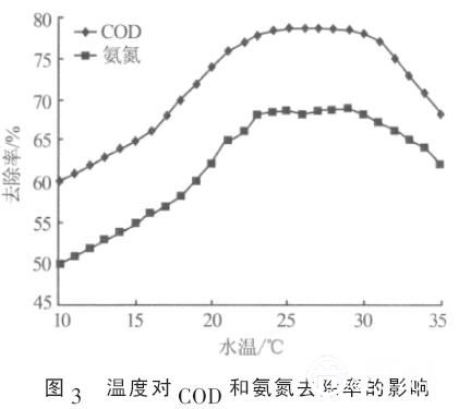 在兩級催化氧化的臭氧質(zhì)量濃度分別為10 mg/L和5 mg/L,空速為3.5 h-1,進(jìn)水pH 為7.5 的條件下,考察溫度對COD 和氨氮去除效果的影響,結(jié)果見圖3?