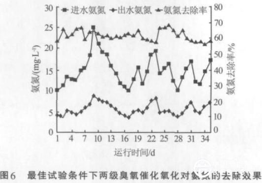 從圖2可以看出,臭氧催化氧化的COD 去除率隨水中臭氧濃度的增加而升高?但是,當(dāng)水中臭氧質(zhì)量濃度>10 mg/L 時,一級臭氧催化氧化的COD 去除率不再有明顯升高,維持在60.17%左右,此時出水COD>60 mg/L,并不能達(dá)到回用要求?因此,增加了二級臭氧催化氧化進(jìn)一步降低COD?由圖2 可知,當(dāng)水中臭氧質(zhì)量濃度為5 mg/L 時,二級臭氧氧化出水COD<60 mg/L,總?cè)コ蕿?5.76%,達(dá)到了回用標(biāo)準(zhǔn)要求?同時,試驗也考察了臭氧濃度對氨氮的去除效果,結(jié)果表明,隨著臭氧濃度的增加氨氮去除率也隨之增加?考慮到能耗等因素,試驗確定兩級臭氧催化氧化的臭氧質(zhì)量濃度分別為10 mg/L 和5 mg/L?