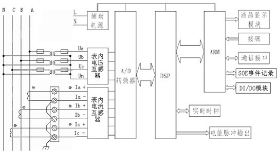 該產(chǎn)品采用當(dāng)今世界流行的高檔電能標(biāo)設(shè)計(jì)方案:DSP+MCU的實(shí)現(xiàn)方法,將DSP的高速數(shù)字信號(hào)處理功能和高檔MCU(ARM)完善的管理、通訊、豐富的接口功能相結(jié)合?;竟ぷ髟砣缦拢?/p>