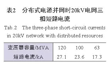 主變壓器容量降低到多大容量合適還需進(jìn)一步考慮20kV電網(wǎng)中分布式電源的影響。按知識(shí)城電網(wǎng)規(guī)劃中最大接入容量30MW的分布式電源考慮,分別進(jìn)行三相短路電流計(jì)算,見(jiàn)表2。