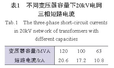 由表1可知,在短路阻抗百分比相同的情況下,變壓器容量越小,20kV電網(wǎng)中的三相短路電流越小。適當(dāng)降低變壓器容量是限制20kV三相短路電流的重要方法。