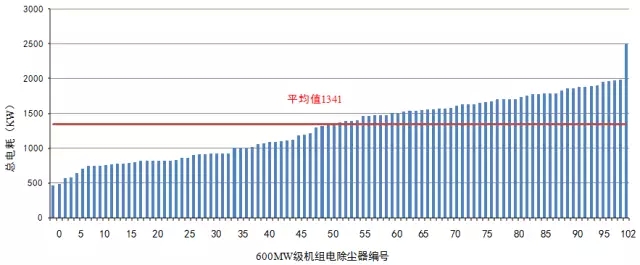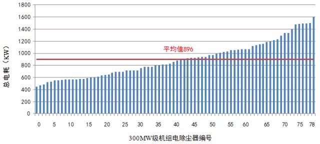1)通過(guò)調(diào)研國(guó)內(nèi)200臺(tái)套燃煤電廠電除塵器電耗,發(fā)現(xiàn)其電耗水平參差不齊,相同等級(jí)機(jī)組配套電除塵器總電耗差距達(dá)4倍以上,表明我國(guó)電除塵器有很大的“節(jié)能”空間,急需出臺(tái)相關(guān)標(biāo)準(zhǔn)予以規(guī)范。