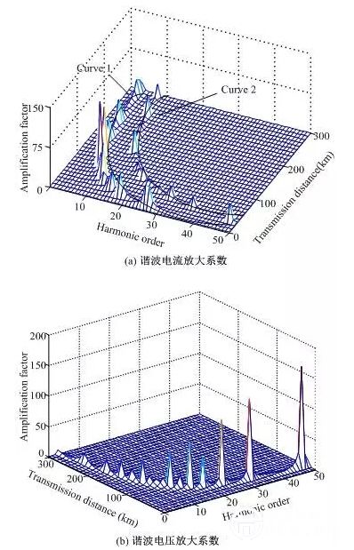 隨著光伏、風(fēng)能等大型分布式電站(10 kV~35 kV等級)的滲透率的提高,主要由多逆變器構(gòu)成的分布式電站系統(tǒng)所產(chǎn)生的諧波與輸配電系統(tǒng)的交互耦合也愈加復(fù)雜。分布式電站輸出的諧波呈現(xiàn)出高頻次、寬頻域的特性。圖3為典型分布式電站諧振放大系數(shù)與諧波次數(shù)、輸電距離的關(guān)系。諧波在輸電網(wǎng)傳播的過程中,受輸電線中的分布電容以及背景諧波電壓等因素的影響,會產(chǎn)生電流和電壓的諧振放大。有2種治理方案可抑制寬頻域諧波在輸電網(wǎng)絡(luò)中的串并聯(lián)諧振問題,即:改變輸電網(wǎng)絡(luò)參數(shù),通過并聯(lián)電抗器達(dá)到消除諧振的目的;安裝高壓混合有源濾波裝置,降低流入電網(wǎng)的諧波電流含量。