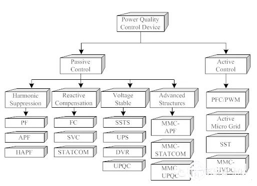 電能質(zhì)量補償控制技術(shù)可分為主動控制技術(shù)和被動治理技術(shù)。圖2針對不同的電能質(zhì)量問題,對相應(yīng)的補償裝置進(jìn)行分類介紹。被動治理技術(shù)是通過并接或串接額外的電力電子補償器來抑制或治理諸如諧波、無功、三相不平衡等電能質(zhì)量問題,補償裝置主要包括無源電力濾波器(PPF)、有源電力濾波器(APF)、混合型有源電力濾波器(HAPF)、無功補償器、動態(tài)電壓恢復(fù)器(DVR)、電能質(zhì)量綜合調(diào)節(jié)器(UPQC)等。其中,基于模塊化多電平變換器(MMC)的電能質(zhì)量補償器因其低壓模塊化串級結(jié)構(gòu),正成為中高壓電能質(zhì)量治理技術(shù)的研究熱點與未來趨勢。而主動控制技術(shù)是用電設(shè)備或分布式電源通過改變自身的輸入或輸出阻抗特性來兼顧電能質(zhì)量治理功能。電能質(zhì)量主動控制技術(shù)不僅可提升電能利用率,還能在無需增加額外的補償器的情況下,改善系統(tǒng)整體的電能質(zhì)量。