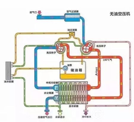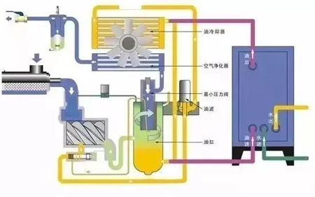 螺桿式空壓機長期連續(xù)的運行過程中,把電能轉(zhuǎn)換為機械能,機械能轉(zhuǎn)換為熱能,在機械能轉(zhuǎn)換為熱能過程中,空氣得到強烈的高壓壓縮使之溫度驟升,這是普通物理學機械能量轉(zhuǎn)換現(xiàn)象。機械螺桿的高速旋轉(zhuǎn),同時也摩擦發(fā)熱,這些產(chǎn)生的高熱由空壓機潤滑油的加入混合成油/氣蒸汽排出機體,這部分高溫油/氣流的熱量相當于空壓機輸入功率的1/4,它的溫度通常在80℃(冬季)-100℃(夏秋季),這些熱能都由于機器運行溫度的要求,被無端地廢棄排往大氣中,即空壓機的散熱系統(tǒng)來完成機器運行的溫度要求。