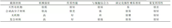 固定化載體種類繁多,選擇理想的載體材料對(duì)固定化微生物的應(yīng)用很關(guān)鍵,需要考慮載體對(duì)固定化微生物的機(jī)械強(qiáng)度、傳質(zhì)性能、彈性、成球難易程度及其生物毒性等方面的影響。理想的載體材料應(yīng)具備以下特點(diǎn):(1)生物相容性良好、不易被生物分解及無(wú)生物毒害性;(2)機(jī)械強(qiáng)度高、傳質(zhì)快、易成球、多孔且比表面積大等物理性質(zhì);(3)價(jià)格低廉、使用壽命長(zhǎng)、存在可引入配基的官能團(tuán)。就目前而言,固定化微生物技術(shù)采用的載體材料主要由3大類組成:有機(jī)載體、無(wú)機(jī)載體和新型復(fù)合載體。