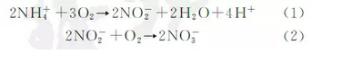 固定化微生物利用固定化載體的內(nèi)部腔體結(jié)構(gòu)對(duì)氧氣擴(kuò)散的影響,形成由內(nèi)至外的厭氧區(qū)、缺氧區(qū)和好氧區(qū),載體外層適宜硝化菌生長(zhǎng),而多數(shù)反硝化菌為兼性菌生長(zhǎng)在載體中間,從而實(shí)現(xiàn)同步硝化反硝化脫氮的目的。氨氧化菌(AOB)和亞硝酸鹽氧化菌(NOB)均屬于硝化菌,硝化作用包括兩個(gè)步驟:(1)氨被AOB快速氧化為亞硝酸鹽(見式(1));(2)亞硝酸鹽被NOB氧化為硝酸鹽(見式(2))。反硝化作用是硝酸鹽、亞硝酸鹽被反硝化菌異化還原為N2或N2O的過程。