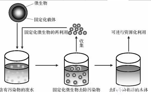 目前已有大量研究表明,固定化微生物技術(shù)對(duì)受污染水體中的重金屬、有機(jī)污染物以及氨氮的去除均能取得較好的效果,并且用于廢水處理后的固定化微生物可多次重復(fù)使用,實(shí)現(xiàn)廢水的資源化利用(見圖2)。