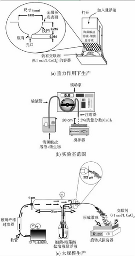 大多數(shù)研究實(shí)驗(yàn)中,固定化微生物的制備是利用注射器手動(dòng)將黏性聚合溶液滴制成固定化小球,這種技術(shù)雖簡(jiǎn)單,但最大的缺陷是固定化小球的制備速率低,此外這還是一項(xiàng)繁瑣的工作。為了克服這些缺點(diǎn),下面闡述了3種固定化裝置:(1)目前有一種可將海藻酸鹽溶液和內(nèi)部電極合并為靜電荷的設(shè)備,能增強(qiáng)海藻酸鹽溶液?jiǎn)畏肿由⑿?,且不影響微生物?xì)胞活性,并能在重力作用下生產(chǎn)固定化微球(見圖1(a),由DEBASHAN等改進(jìn));(2)另外一種自動(dòng)化工序可用于實(shí)驗(yàn)室范圍所需的固定化量,并具有高效低耗、經(jīng)濟(jì)適用、易產(chǎn)業(yè)化、運(yùn)行管理容易等特點(diǎn),這種工序的基本設(shè)備包括蠕動(dòng)泵、輸液管、注射器等(見圖1(b));(3)為了滿足大型廢水的處理效果,需要長(zhǎng)時(shí)間大規(guī)模生產(chǎn)固定化微生物小球,此時(shí)多噴嘴包埋/固定化系統(tǒng)誕生了,它是以上層流射分裂技術(shù)為基礎(chǔ)進(jìn)行設(shè)計(jì)的,以1~15mL/min的速率在無(wú)菌固定化裝置中連續(xù)生產(chǎn)不同直徑(250~1000μm)的固定化小球,可用于不同類型的海藻酸鹽溶液固定微生物,噴射出形態(tài)規(guī)則的固定化小球(見圖1(c),由BASHAN等改進(jìn))。