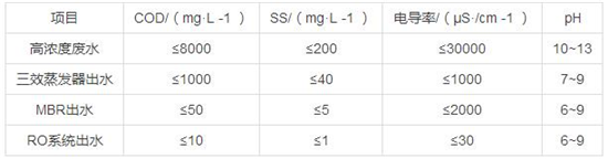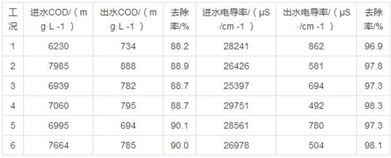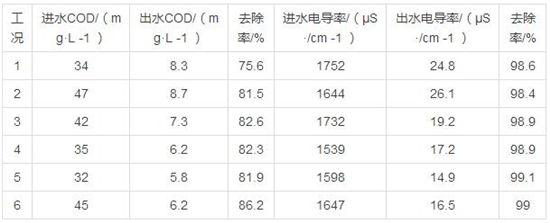 經(jīng)過處理后的回用水水質(zhì)要求:COD≤10 mg/L,電導率≤30 μS/cm,pH為6~9。