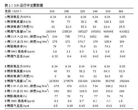 在實(shí)際運(yùn)行中,氨氣/空氣混合氣體,氨濃度范圍為3%~~5%,稀釋風(fēng)量一定,額定風(fēng)量為4820m3/h。當(dāng)負(fù)荷變化時(shí),通過調(diào)節(jié)兩側(cè)氨流量閥來控制氨濃度,從而保證負(fù)荷在170~~300MW變化間脫硝效率均能維持在70%以上(如下表1),出口煙氣NOx濃度降至200mg/Nm3,并且在氨逃逸不超出空預(yù)器所承受值的情況下,可以適當(dāng)設(shè)定出口出口煙氣NOx濃度,以降低NOx總的排放量,減輕對(duì)大氣環(huán)境的污染。