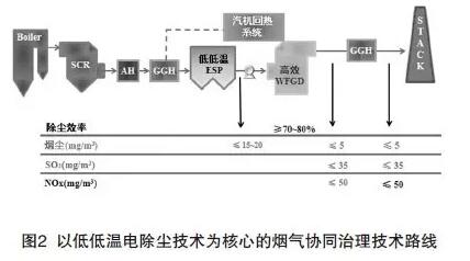 隨著《浙江省大氣污染防治行動計劃(2013~2017年)》的出臺,華能長興電廠需要實現(xiàn)最終煙塵排放小于5mg/Nm3的設(shè)計值。長興電廠根據(jù)經(jīng)濟(jì)性及技術(shù)合理性分析,最終確定采用以低低溫電除塵技術(shù)為核心的煙氣協(xié)同治理技術(shù)路線(如圖2所示)。該技術(shù)路線通過低低溫電除塵器有效降低除塵器出口的煙塵濃度,同時借助了高效濕法脫硫技術(shù)。該技術(shù)由于采用了漿液洗滌的氣液接觸方式,不但具有良好的脫硫功能,而且具有一定的除塵功能,可將從電除塵器逸出的顆粒物進(jìn)行二次捕集,從而降低煙塵排放濃度,達(dá)到協(xié)同治理的效果。