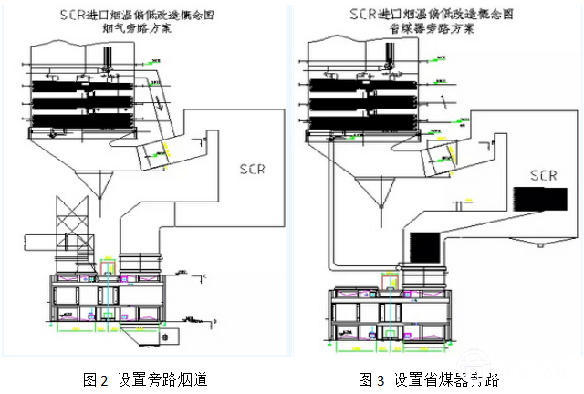 采用技術(shù)路線2,提高脫硝裝置SCR入口煙氣溫度,一共有四種方案供選擇,即:設(shè)置旁路煙道、設(shè)置省煤器旁路、省煤器分級(jí)改造、回?zé)岢槠a(bǔ)充給水加熱改造。
