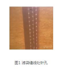 表1中幾個項(xiàng)目的濾袋在縫線處均未進(jìn)行涂膠處理,而濾袋縫線處的針孔對排放有較大影響,我公司對不同濾袋生產(chǎn)廠家的濾料樣品按VDI3926標(biāo)準(zhǔn)進(jìn)行了過濾性能測試,結(jié)果顯示,當(dāng)縫線處的針孔處理較好時,濾料本身的過濾精度沒有太大的變化;但當(dāng)縫線處的針孔處理不好形成較大的針眼時,排放濃度從濾料本身的0.27mg/m3增大到62.7mg/m3。濾袋縫線處針孔如圖1所示。