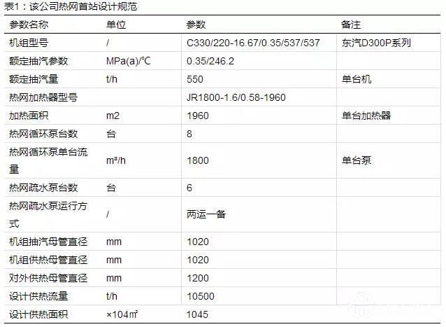 該公司熱網(wǎng)首站為單元制,每臺機設(shè)置2臺熱網(wǎng)加熱器,4臺熱網(wǎng)循環(huán)泵,3臺熱網(wǎng)疏水泵,兩臺熱網(wǎng)補水泵和一臺低壓除氧器。每臺機進回水母管直徑為1020mm,首站出口供回水母管為1200mm,為配合熱泵建設(shè)和熱網(wǎng)遠(yuǎn)期發(fā)展需要,與熱泵工程同步建設(shè)了兩條1200mm供熱母管。首站設(shè)計相關(guān)參數(shù)見表1。