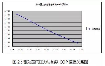 圖2為熱泵調(diào)研階段由熱泵某廠家提供的驅(qū)動蒸汽壓力與熱泵COP值的關(guān)系圖。從圖2中可以看出,驅(qū)動蒸汽壓力越高,熱泵的效率越高。主要原因是熱泵設(shè)計使用的驅(qū)動蒸汽熱量主要來自于蒸汽的汽化潛熱,而壓力越高,在同樣蒸汽耗量的情況下,蒸汽提供的汽化潛熱越高,因此,最終熱泵的COP值也會升高。