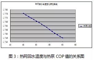 圖3為熱泵某廠家提供的熱網(wǎng)回水溫度與熱泵COP值的關(guān)系圖。從圖3中可以看出,熱網(wǎng)回水溫度越低,熱泵的效率越高。主要原因是熱網(wǎng)回水溫度越低在吸收器中與高溫溴化鋰溶液的傳熱溫差越大,在熱泵溴化鋰溶液降溫梯相同和同樣熱網(wǎng)水流量的熱網(wǎng)水能夠吸收更多的熱量,最終提升了熱泵機組的有效吸熱量。
