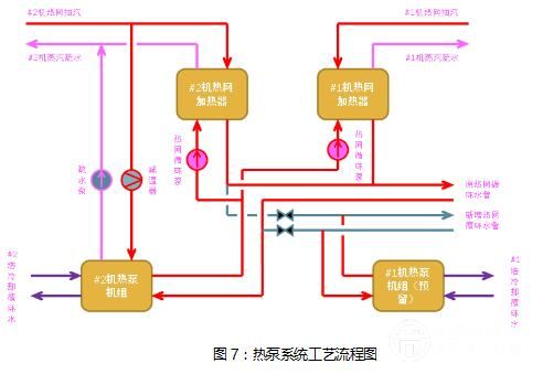 熱網(wǎng)水邊界參數(shù)是按照實際歷年熱網(wǎng)運行的平均回水溫度選取的55℃,熱泵機組的溫升選取55-75℃。熱網(wǎng)水加熱不足的部分繼續(xù)進入熱網(wǎng)加熱器加熱到熱網(wǎng)需要的溫度。在汽輪機組變工況運行或熱網(wǎng)溫度變化時,達(dá)不到此熱平衡時,系統(tǒng)設(shè)計有部分水去冷水塔的旁路管和升壓泵,可以保證系統(tǒng)正常循環(huán)。