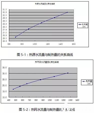 圖5-1和圖5-2是某熱泵廠家提供的熱源水流量與制熱量的關(guān)系曲線和熱網(wǎng)水流量與制熱量的關(guān)系曲線。從圖中可看出,熱源水和熱網(wǎng)水流量的增加都是與熱泵的制熱量是正相關(guān)關(guān)系。因此,增加項目設(shè)計的熱源水和熱網(wǎng)水流量可以使熱泵提取更多的余熱,實現(xiàn)更多的制熱量的。但在實際工程應(yīng)用中,這兩個水流量是由汽輪機組的循環(huán)水系統(tǒng)冬季運行方式和熱網(wǎng)供熱需求決定的。同時,這兩個流量的選取也受熱泵建設(shè)場地、單臺熱泵最大容量等條件的限制。
